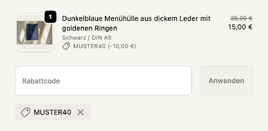Verwenden Sie den Aktionscode MUSTER40 an der Kasse, um Ihr Muster zum bestmöglichen Preis zu erhalten.